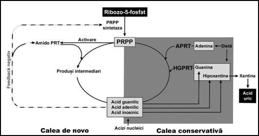 reglarea prin feed-back negativ realizata de nucleotidele purinice prin doua enzime: amido-fosfo-ribozil-transferaza (amido-PRT) si 5-fosfo-ribozil-1-pirofosfat-sintetaza (PRPP) si