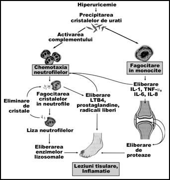 Cresterea nivelului de acid uric in sange si alte lichide din organism (lichidul sinovial) favorizeaza precipitarea acestuia sub forma de cristale de urati de sodiu. Aparitia acestor cristale la nivelul articulatiilor determina activarea complementului si atragerea de polimorfonucleare neutrofile si macrofage la nivel membranelor sinoviale. Fagocitarea acestor cristale genereaza radicali liberi si leukotriene (mai ales leukotriene B4) cu efect inflamator. Neutrofilele lizate elibereaza enzimele lizosomale, cu efect proteolitic.