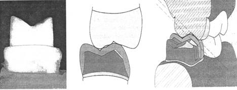 3. Dispozitivul coronar inlocuieste structurile pierdute ale coroanei dintelui; este turnat din aliaje metalice impreuna cu dispozitivul radicular = DCR).