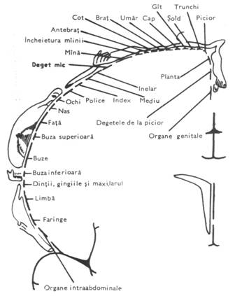 rasturnata a corpului a primit numele de homunculus senzitiv, in care buzele, limba, mana cu degetele (in