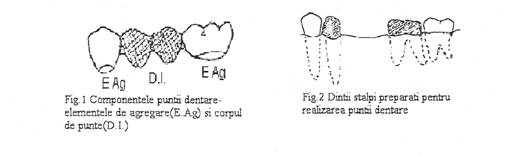 2.2. Elementele de agregare de care este solidarizat corpul de punte la extremitati si realizeaza fixarea prin cimentare pe dinti stalpi a intregii proteze. Elementele de agregare sunt in numar de cel putin doua, asezate in general, pe cei doi dinti limitanti ai bresei edentate (fig. 1).