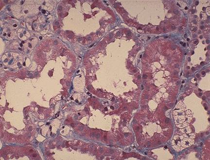 Microscopie optica (MO): In fazele initiale ale bolii glomerulii apar normali, la 10 ani de evolutie a bolii leziunile sunt prezente la aproximativ 30% din glomeruli, iar in decurs de 30 ani la aproximativ 90%. Acestea sunt nespecifice: initial hipercelularitate mezangiala, apoi glomeroloscleroza focala asociata cu infiltrate interstitiale. [3]