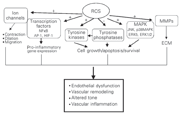 Figura 13. Cai de semnalizare redox-dependente. Speciile reactive de oxigen modifica activitatea tirozin kinazelor ca: Src, Ras, JAK2, Pyk2, PI3K, si EGFR, precum si a MAPK, in particular p38MAPK, JNK si ERK5. ROS pot inhiba activitatea protein-tirozin fosfatazelor, contribuind in plus la activarea protein tirozin kinazelor. De asemenea, ROS influenteaza expresia genica si proteica prin activarea factorilor de transcriptie NFkB, activator protein-1 (AP-1) si factorul ce induce hipoxia (HIF-1). ROS stimuleaza canale ionice de Ca2+ si K+ ducand la modificari ale concentratiei cationilor. Activarea acestor cai sensibile-redox de catre glucoza crescuta duce la diferite raspunsuri celulare care contribuie la aparitia bolilor cardiovasculare asociate diabetului. (-, efect inhibitor; +, efect stimulator; ECM, matrice extracelulara; MMPs, metaloproteaze matriceale; dupa Touyz et al., 2002)