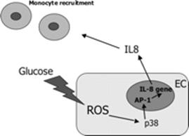 Factorii de transcriptie au fost primele proteine semnalizatoare identificate ca sensibile-redox. Factorul de transcriptie kB (NF-kB), care este activat de glucoza crescuta in celulele vasculare, este prototipul factorilor de transcriptie sensibili-redox. Desi diabetul si hiperglicemia induc multiple modificari in metabolism si semnalizare, studiile existente sugereaza ca activarea factorului de transcriptie NF-kB poate fi o trasatura semnificativa a complicatiilor diabetice. Recent, NF-kB activat a fost asociat cu placile aterosclerotice la pacientii cu diabet de tip2 [Cipollone et al., 2003]. Diverse tipuri celulare ca celule musculare netede [Yerneni et al., 1999], celule endoteliale [Chen et al., 2003; Li et al., 2003; Golovchenko et al., 2000], pericite [Romeo et al., 2002], celule mesangiale [Ha et al., 2002] prezinta activitate crescuta a factorului de transcriptie NF-kB cand sunt activate de concentratii de glucoza crescuta. ROS influenteaza acivitatea NF-kB prin modificarea oxidativa a reziduurilor cisteinice, prin degradarea IkB si prin declansarea cascadelor de semnalizare a caror tinta este NF-kB [Droge, 2001]. NF-kB regleaza transcriptia multor gene implicate in inflamatie si crestere, incluzand interleukine, molecule de adeziune si proto-oncogene [Thannickal & Fanburg, 2001]. Alti factori de transcriptie activati de ROS sunt AP-1 si HIF-1. AP-1 este un factor de transcriptie complex format prin homo sau heterodimerizarea membrilor familiilor c-Jun si c-Fos si influenteaza diferentierea si cresterea celulelor vasculare. ROS regleaza activitatea AP-1 prin intermediul a numeroase mecanisme si tinte, incluzand glutationarea-S a unei singur reziduu cisteinic conservat, reglarea redox reversibila prin tioredoxina si proteina nucleara Ref1 [Xanthoudakis S & Curran,1992] si prin reglarea cascadei c-Jun N-terminal kinazei (JNK). ROS produs de glucoza crescuta stimuleaza calea p38 MAP kinaza, care in plus, activeaza factorul de transcriptie AP-1. Activarea AP-1 duce la transcriptia genelor inflamatoare, avand ca efect cresterea productiei endoteliale de IL-8 (figura 14). Eliberarea chemokinei IL-8 de celulele endoteliale mediaza recrutarea si adeziunea monocitelor la endoteliu in inflamatie si complicatiile vasculare ale diabetului [Srinivasanet al., 2003].