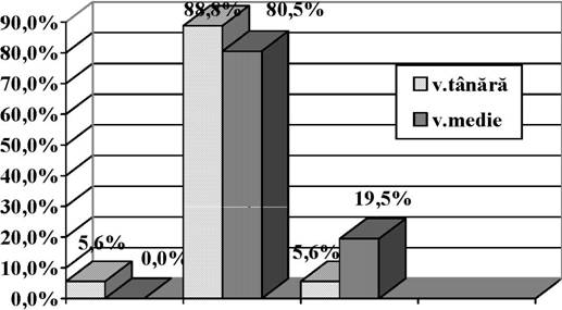 1.Din figura 2 se constata ca forma moderata de boala se intalneste aproximativ identic atat la varsta tanara cat si medie(88,8% vs 80,5%);forma usoara este intalnita la varsta tanara (5,6%) iar forma grava se intalneste la pacientii de varsta medie(19,5%).
