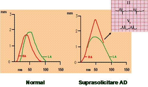 ECG: semne de suprasolicitare AD (P 'pulmonar') si VD (unde R ample in V1 cu R/S > 1)