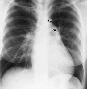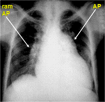 Rx cord-pulmon: circulatie pulmonara 'incarcata' cu ramurile AP dilatate in hiluri si extremitati 'retezate' avind periferie mult mai clara decat normal, bombare a conului arterei pulmonare, semne de hipertrofie VD