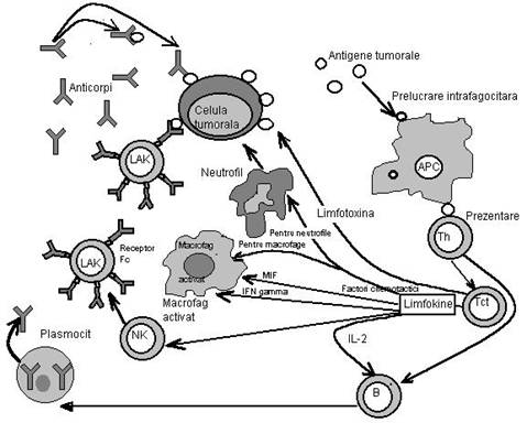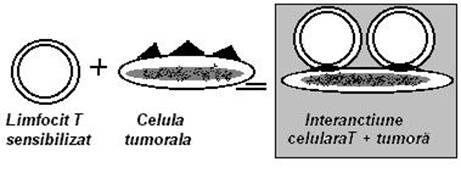 ~n acest proces intervin `n mod deosebit limfocitele Tc, celulele NK si macrofagele. ~ntr-o prima faza, celulele T recunosc ca non-self, celulele tumorale. Aceasta recunoastere se face `n prezenta si cu contributia macrofagelor, care de altfel participa si la reactia inflamatorie tisulara locala.Asemenea procese inflamatorii activeaza macrofagele, care devin capabile sa distruga nespecific celulele tumorale.