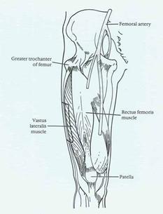 La nivelul coapsei, campul de injectare se afla in treimea medie a fetei externe a coapsei, mediolaterale (Pe fata interna se afla artera si vena femurala si nervul femural). Masa musculara este formata din muschiul cvatriceps, mai ales de muschiul vast lateral in care se face injectarea. Zona de injectare este mai mica decat fesier. Cantitatile de peste 1ml si substantele uleioase se administreaza numai fesier pentru a evita durerea.