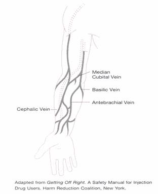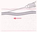 se inteapa in mijlocul venei in directia axului venei cu bizoul in sus. Se impinge acul dealungul venei 1-1,5 cm. Repetarea injectiei in aceeasi vena se face tot mai central fata de cele anterioare si nici o data mai periferic.
