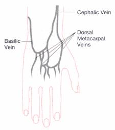 Cautarea venei: se face cu atentie, daca mentinerea acului este indelungata se va evita regiunea unei articulatii. Se inspecteaza si se palpeaza cu atentie (fiecare asistent isi va stabili la ce deget au simtul pipaitului mai dezvoltat prin palparea unor bolduri cu gamalia de diferite marimi, asezate sub o fata de masa).