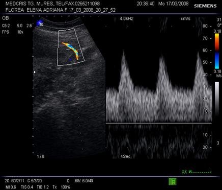 Aspectul eco Doppler normal in ductul venos este de sistola ventriculara, diastola ventriculara, contractie atriala, deci aspect trifazic.