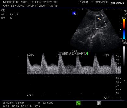 Fig. nr. 318. Doppler normal in artera uterina dupa 26 sapt.