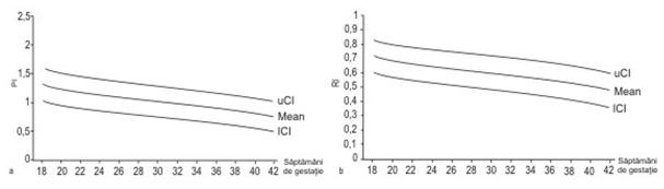 Fig. nr. 320. Artera ombilicala, stanga indicele de pulsatilitate , dreapta indicele de rezistenta, valorile normale intre a 5 a si a 95 a percentila, scad cu cresterea fetala. ( adaptat dupa Merz [16] )