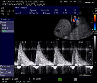 In situatii de rezistenta placentara si mai crescuta, se poate ajunge la flux diastolic absent, sau componenta diastolica negativa (reverse flow) ceea ce indica o alterare grava a hemodinamicii fetoplacentare. [3,14,17]