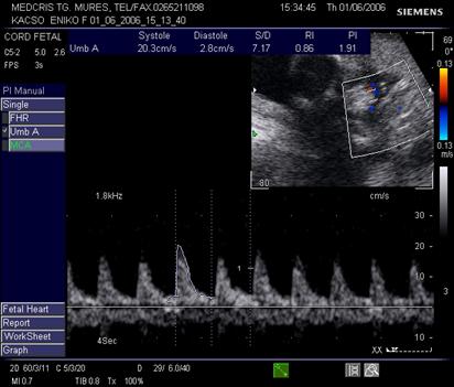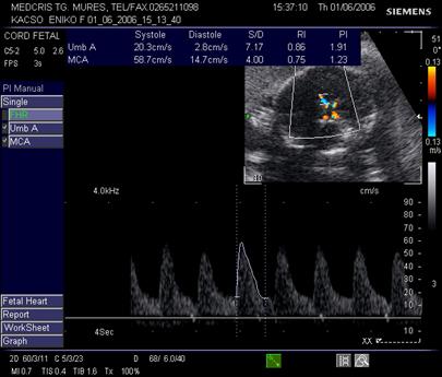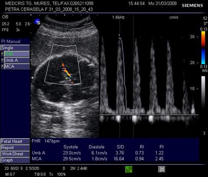 Fig. nr. 326. Doppler pe artera cerebrala medie cu diastola crescuta si inversarea indicilor de rezistenta ( indicele Arbeille subunitar ) la fat de 34 sapt cu retard major de crestere intrauterina si sdr genetic