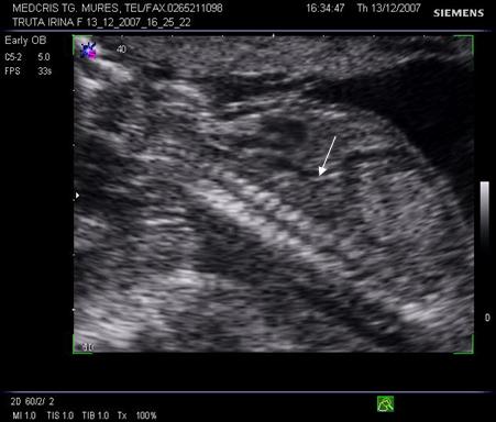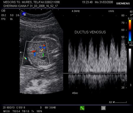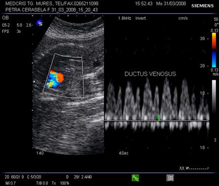 Aspecte patologice ale spectrului Doppler constau in pulsatii venoase. Acestea par fiziologice, in timpul miscarilor respiratorii, iar patologice in trim. II si III in anomalii cardiace, aritmii sau insuficiente cardiace. Daca sunt asociate cu absenta fluxului end - diastolic in artera ombilicala, e vorba de insuficienta placentara si mortalitate de 50 - 60% [10,12].