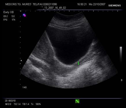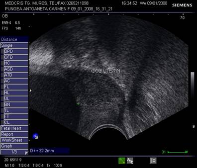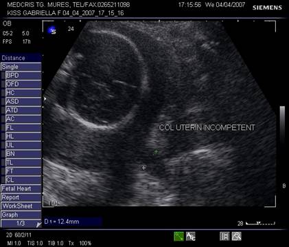 Fig. nr.235. Col incompetent la 24 saptamani, se remarca forma de V , la nivelui orificiului cervical intern, intre calipere