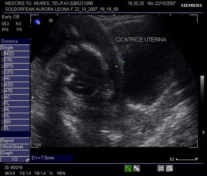 Fig. nr.233. Cicatrice uterina postoperatie cezariana ( cu hiperecogenitati , intre calipere ) pe segmentul unei sarcini de 24 sapt