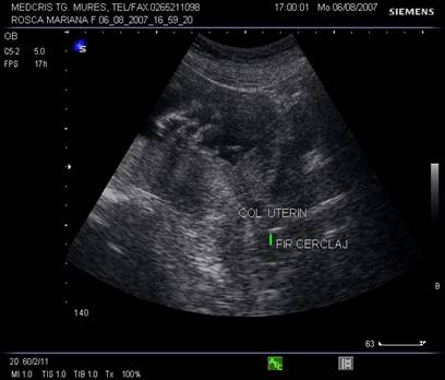 Fig. nr.234. Col uterin evaluat prin ecografie transvaginala , la o sarcina de 26 saptamani cu iminenta de nastere prematura prin contractii uterine, se remarca lungimea sa normala, canalul cervical si orificiul cervical intern inchis