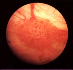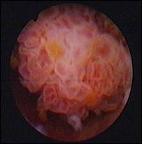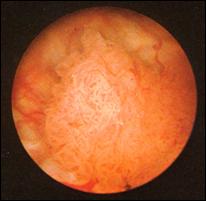 Figura 49. a,b) Aspecte cistoscopice de tumori vezicale. Tumori exofitice inconjurate de epiteliu vezical normal [43].