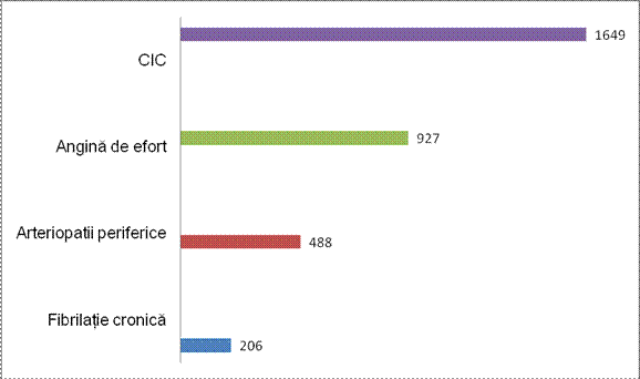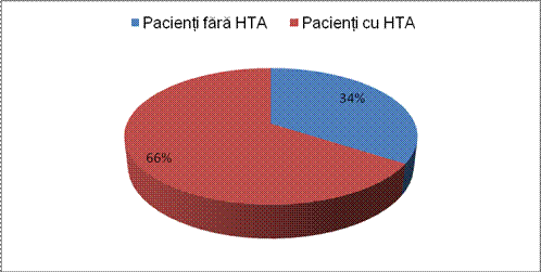 Comorbiditati asociate HTA au fost cardiopatie ischemica cronica cu 78,33%, angina pectorala de efort 44,03%, arteriopatii periferice 23,18% iar fibrilatia atriala cronica 9,78%.