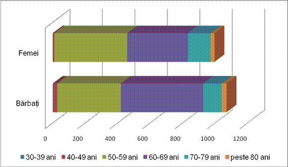 Grupa de varsta cea mai afectata a fost grupa 60-69 ani cu un procent de 41,85%, respectiv grupa 50-59 de ani cu 39,95%. Gradul de afectare avand in vedere atat grupele de varsta cat si sexul pacientilor, releva o incidenta mai mare a HTA la femei la grupa de varsta 50-59 ani cu procentul de 46,09%(din totalul de 974 persoane de sex feminin), in timp ce la barbati incidenta cea mai mare se gaseste intre 60-69 de ani cu 38,09%(din totalul de 1331 persoane de sex masculin).