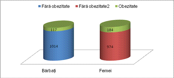 În ceea ce priveste obezitatea, 14,29% din persoane asociaza si obezitate, aceasta fiind mai frecventa in randul femeilor-18,8% fata de 10,3% in cazul barbatilor. Este mult mai frecventa asocierea HTA-DZ tipII-Obezitate care reprezinta 4,89% fata de asocierea separata a HTA cu obezitatea-9,4%, sau a DZ tip II cu obezitatea-1,99%.