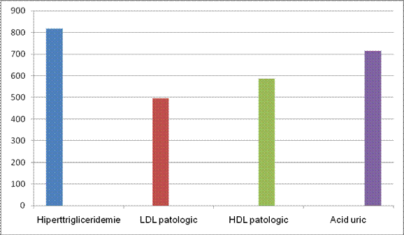 Cu privire la studiul analizelor de laborator 38,85% prezinta hipertrigliceridemiei, 27,88% valori scazute ale HDL-colesterolului, 23,56% valori ridicate ale LDL-colesterolului, iar 33,96% valori ridicate ale acidului uric.