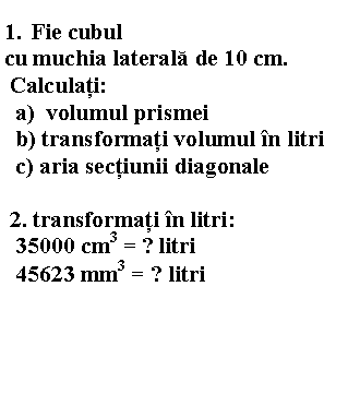 Plansa a patra reprezinta un cub desenul complectat si cu textul problemei pe care trebuie sa o rezolve, de asemenea la punctul 2 sunt transformari, de asemenea vor avea la dispozitie o sticla de un litru plina cu apa si un cub din plastic cu muchia de 10 cm pentru a demonstra colegilor ceea ce au calculat.
