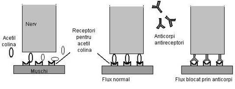 Transmiterea influxului nervos de la nervi la muschi se realizeaza insa tosmai prin acetilcolina. Daca acest mediatir nu se mai poate fixa pe fibra musculara din cauza blocarii prin anticorpi a receptorilor care-i sunt destinati, comanda nervoasa nu mai este receptata la nivelul muschiului. Autoanticorpii induc leziuni postsinaptice ale membranei musculare prin activarea complementului si distrugerea receptorilor. Anticorpii mai pot provoca acest efect distructiv printr-o legare incrucisata a receptorilor din placa motorie, urmata de distrugerea lor prin lizozomi celulari. Consecutiv agresiunii autoimune, s-a constatat la om reducerea receptorilor, din numarul lor initial, ramanand functionali numai 30-50%. Efectul blocant al anticorpilor asupra receptorilor poate fi contracarat prin administrarea de anticolinesteraza.