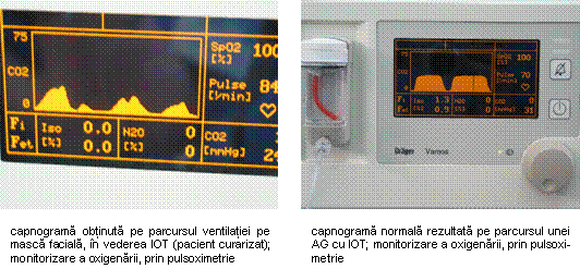 - in cazul anesteziilor generale (AG) cu intubatie oro-traheala (IOT), aceasta este monitorizata prin intermediul capnografului; capnograma obtinuta confera date importante despre amplasarea corecta a sondei de IOT, setarea parametrilor ventilatori, anumite accidente si/sau incidente ce pot surveni pe parcursul desfasurarii unei AG cu IOT;
