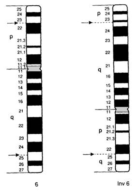 b)inversia paracentrica este rezultatul unor rupturi si a unui rearanjament de aceeasi parte a centromerului. Cromozomul rezultat va avea avelasi aspect morfologic dar va prezenta o ordine modificata a benzilor din structura.