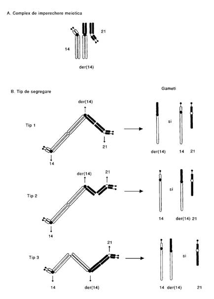 Cromozomii parentali purtatori ai unei translocatii robertsoniene (14q21q )+ sunt reprezentati in fig. 14. Complexul reprezinta 3 structuri cu segmente omoloage pentru cromozomii interesati. B. Sunt posibile 3 tipuri de segregare. In tipul 1, cromozomul translocat (der.14) segrega de cromozomii 14 si 21. Fecundarea gametilor rezultati va produce un cariotip cu translocatie echilibrata sau unul normal in ambele situatii fenotipul fiind normal. In segregarile tip 2 si 3 toti gametii rezultati vor fi anormali si va rezulta o trisomie sau monosomie pentru bratul lung al cromozomului q atat pentru cromozomul 21 cat si pentru cromozomul 14. Numai unul din gametii tipului 2 (der. 14 si 21) vor permite dupa fecundare realizarea unui zigot viabil. Acesti copii vor prezenta s. Down(trisomie 21 q)].