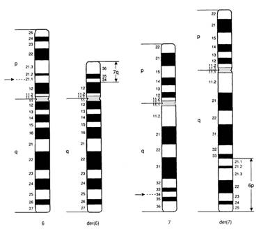 segmentele omoloage ale celor doua perechi de cromozomi implicati in translocatie si cromozomii translocati (der 6, der 7) vor forma un complex in cruce (cu 4 structuri)