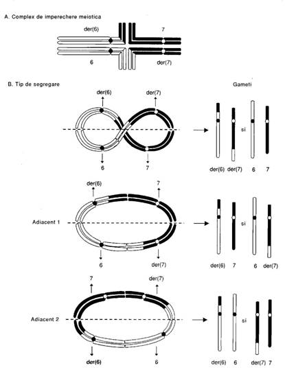 A. Segmentele omoloage ale perechilor de cromozomi implicati se aseaza in cruce. B. Segregarea se poate face in 3 tipuri dupa cum centromerii perechilor de cromozomi vor fi alternanti sau adiacenti fusului de diviziune in anafaza. Gametii rezultati vor purta o translocatie echilibrata sau vor fi normali cand segregarea este alternativa. In segregarile adiacente 1 si 2 se produc gameti anormali fie cu duplicatii fie cu deficiente de segmente cromozomiale.