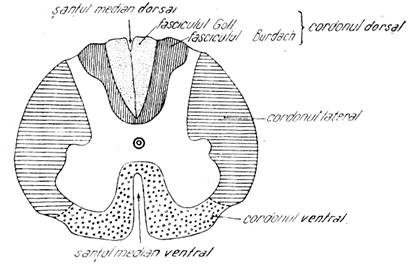 Aceste santuri delimiteaza in fiecare jumatate a maduvei spinarii, trei cordoane ale substantei nervoase albe: