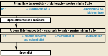 Tratamentul de eradicare este reprezentat de doua linii terapeutice: prima linie terapeutica consta in tripla terapie iar a doua linie in terapia cvadrupla;