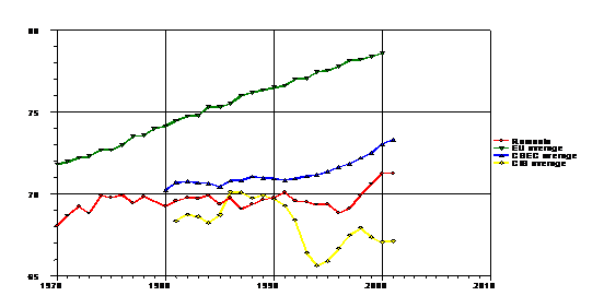 Figura 2: Speranta de viata la nastere in Romania si Europa (1970 - 2001)