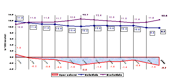 Excedentul natural negativ inregistrat inca din 1992 este consecinta scaderii natalitatii, tendinta care se constata si in prezent, asociata cu o usoara crestere a mortalitatii generale.