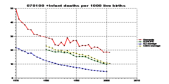 Mortalitatea infantila este indicatorul de sanatate care exprima in modul cel mai pregnant nivelul de viata si civilizatie al unei populatii. In pofida tendintei de scadere constante a ratei mortalitatii infantile, Romania continua sa se situeze pe primele locuri in Europa la acest capitol (18,4 decese 0-1 an la 1000 nascuti vii).