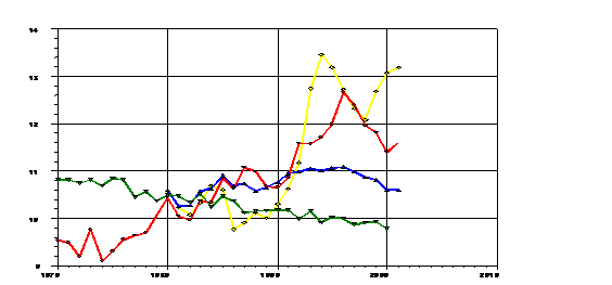 Figura 7: Evolutia mortalitatii generale in Romania si Europa (1990-2000)