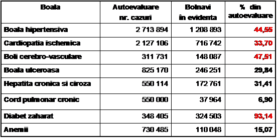In Romania, decesele datorate bolilor cardiovasculare au o frecventa este in crestere spre deosebire de tendinta de reducere evidenta in majoritatea tarilor europene. Ca principale entitati din Romania semnalam: cardiopatia ischemica inclusiv infarctul, bolile cerebrovasculare, hipertensiunea arteriala care desi poate fi controlata se manifesta in continuare ca principal factor de risc.