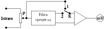 Cu ajutorul comutatorului K, aparatul de masura (mV) poate fi conectat alternativ la intrare (K in pozitia 1) si dupa filtrul opreste banda (K in pozitia 2). Masurarea se efectueaza in doua etape. In prima etapa, comutatorul K se fixeaza in pozitia "1". Cu ajutorul potentiometrului P, nivelul semnalului de intrare este adus la o valoare prestabilita (acul indicator al mV se aduce in dreptul unui reper fix a de pe scara gradata). Aceasta valoare constanta (de referinta) este determinata de valoarea efectiva a semnalului (fundamentala + armonica).