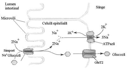 Transportorul simport de Na+ si glucoza de la polul apical al celulei intestinale preia din intestin glucoza odata cu patrunderea a doi ioni Na+ in celula, glucoza putandu-se acumula pana la o concentratie de 30000 ori mai mare decat in lumenul intestinal. Pe masura ce glucoza este pompata in enterocite, ea este eliminata simultan la polul bazal prin difuzie facilitata de transportorii GluT2 aflati in membrana enterocitelor.