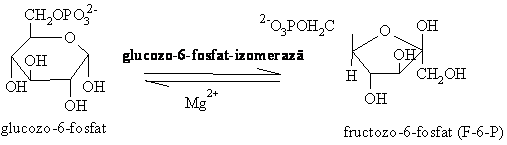 2. Izomerizarea glucozo-6-fosfatului la fructozo -6- fosfat (F-6-P) este o reactie reversibila catalizata de glucozo-6-fosfat izomeraza. Echilibrul reactiei este deplasat spre stanga, astfel ca viteza de formare a fructozo-6-fosfatului este franata ( G'0 =1,7 kJ/mol).