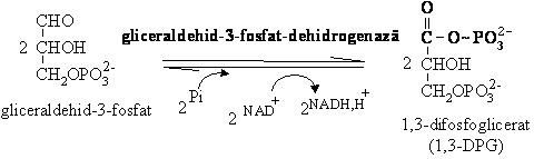 Oxidarea fosforilanta a gliceraldehid-3-fosfatului. Aceasta reactie presupune oxidarea grupei aldehidice de la C1 la grupa carboxil si fixarea unui rest fosfat sub forma de anhidrida. Anhidrida formata are o energie libera foarte mare la hidroliza ( G - 49,3 kJ/mol).