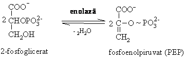 Deshidatarea 2-fosfogliceratului. Enolaza catalizeaza o reactie reversibila prin care rezulta al doilea intermediar macroergic al glicolizei, fosfoenolpiruvatul (PEP) ( G'0 = 7,5 kJ/mol).
