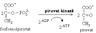 Hidroliza fosfoenolpiruvatului cu transferul grupei fosfat pe ADP se desfasoara sub actiunea piruvat kinazei, enzima ce necesita prezenta ionilor K+ si Mg2+. Si aceasta este o reactie de fosforilare la nivel de substrat realizata pe seama energiei inmagazinate ( G'0 = -31,4 kJ/mol). Aceasta reactie este un punct important de reglare a glicolizei, enzima fiind inhibata de ATP si activata de fructozo-1,6-difosfat.