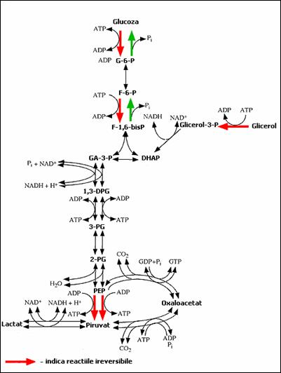 Din cele 11 etape ale glicolizei, 3 sunt ireversibile si sunt catalizate de enzime ce au rol in controlul sensului pe care il ia transformarea intermediarilor glicolitici in functie de necesitatile organismului: